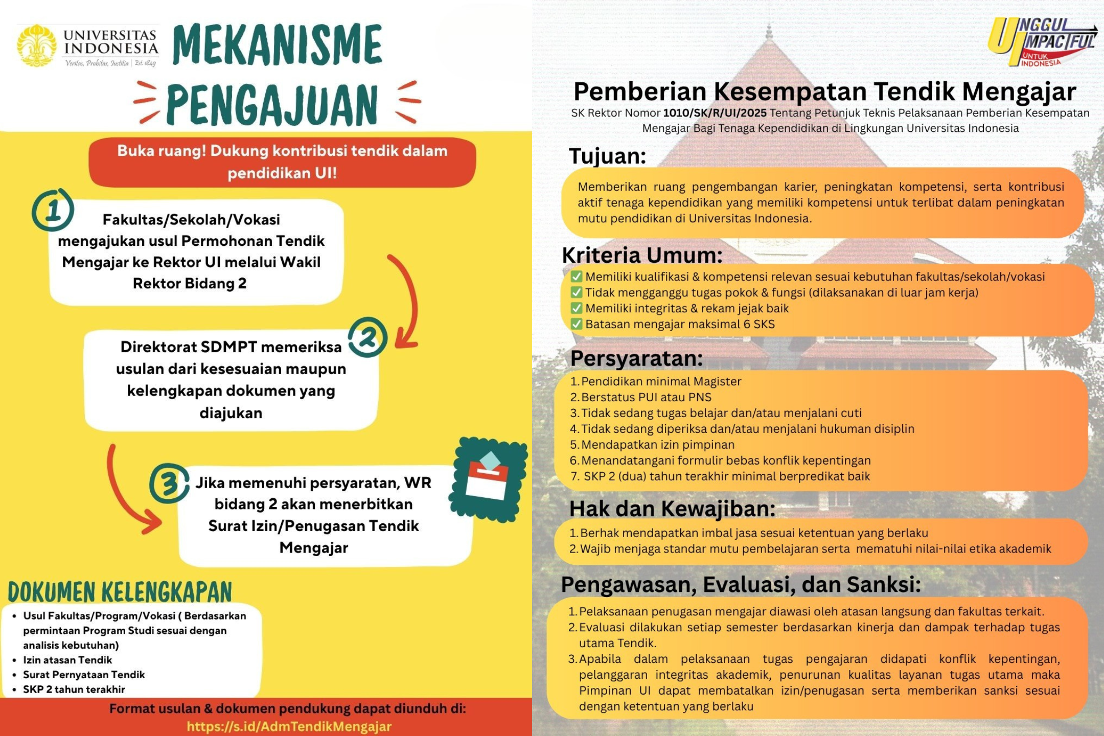 Melalui SK Rektor Nomor 1010/SK/R/UI/2025, UI memberikan kesempatan kepada tendik di lingkungan UI untuk mengajar maksimal 6 SKS di luar jam kerja utama, tanpa mengganggu tugas pokok dan fungsi.